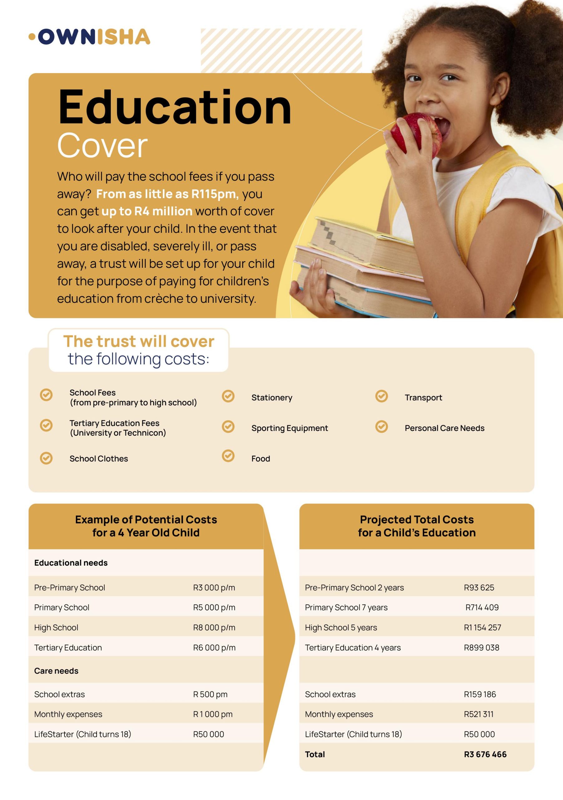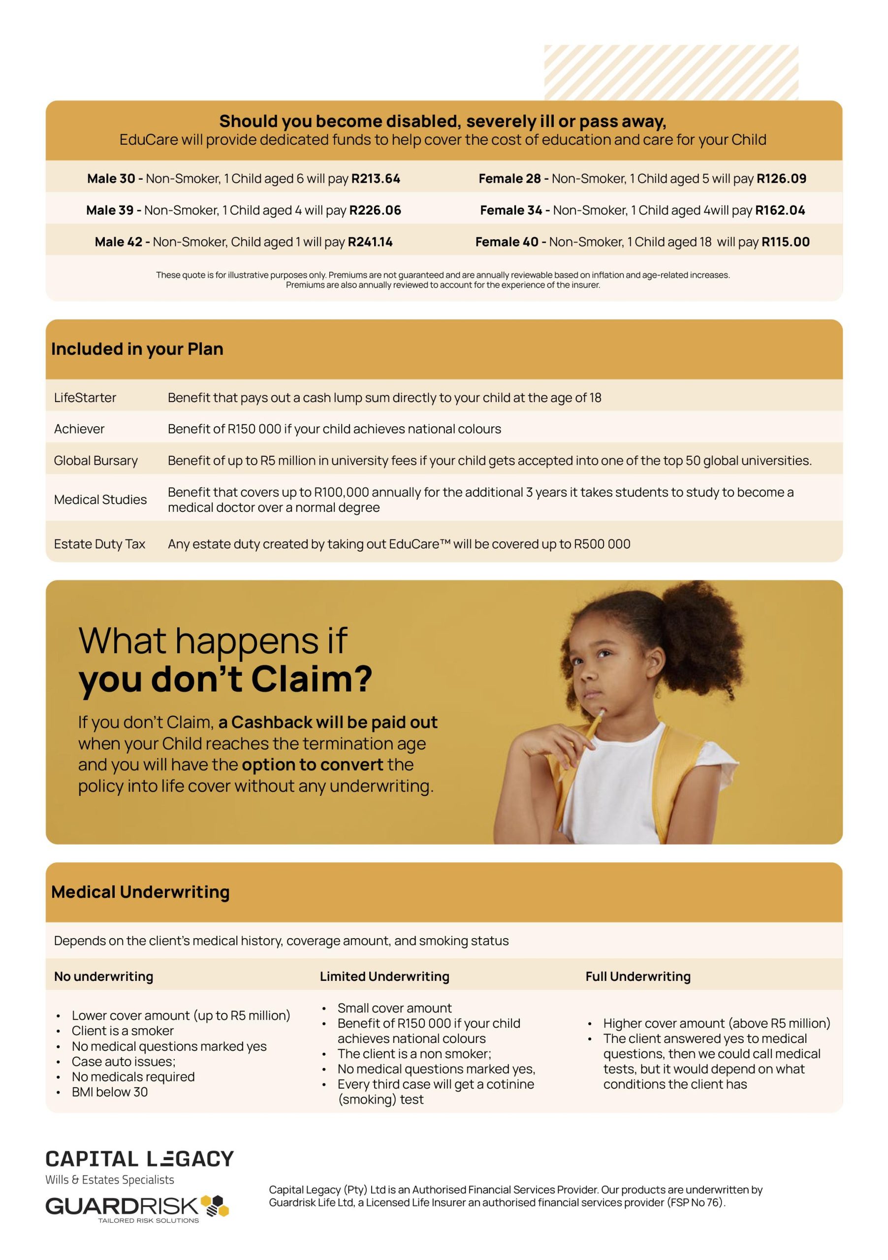 In the event of your death, we establish a trust for your child and cover the cost of their education up to university. This ensures that your child receives a quality education, thereby securing their future. Cover from R115 pm